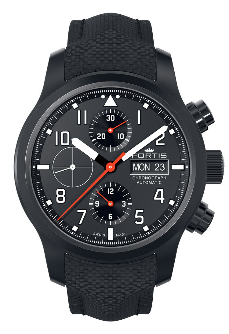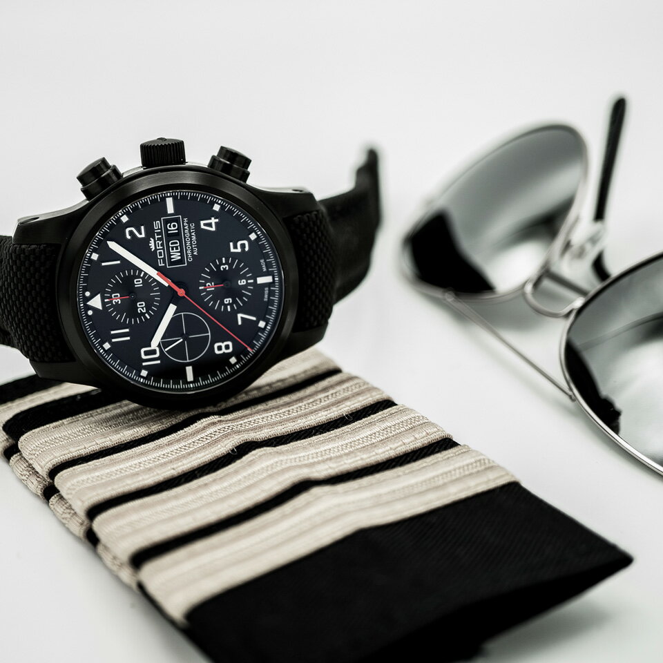ブラックPVD仕上げのステンレススチール製ケースにブラックダイヤルを備えたこのモデルは、コックピット内で遭遇する強い反射でも高い視認性を確保します。