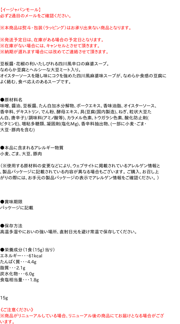 ●原材料名 味噌、醤油、豆板醤、たん白加水分解物、ポークエキス、香味油脂、オイスターソース、香辛料、デキストリン、でん粉、酵母エキス、具(豆腐(国内製造)、ねぎ、粒状大豆たん白、唐辛子)/調味料(アミノ酸等)、カラメル色素、トウガラシ色素、酸化防止剤(ビタミンE)、増粘多糖類、凝固剤(塩化Mg)、香辛料抽出物、(一部に小麦・ごま・大豆・豚肉を含む) ●本品に含まれるアレルギー物質 小麦、ごま、大豆、豚肉 (※使用する原材料の変更などにより、ウェブサイトに掲載されているアレルゲン情報と、製品パッケージに記載されている内容が異なる場合もございます。