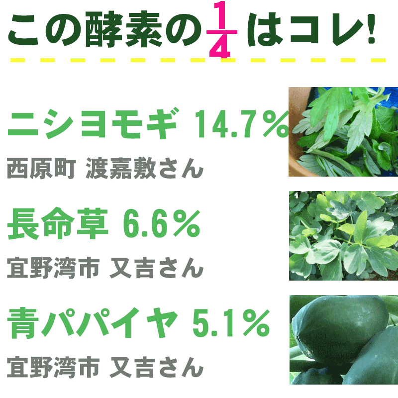 昔ながらのおばぁの酵素 2017年夏仕込みの特徴 ▼ 無農薬栽培ニシヨモギ(フーチバー)14.7%、長命草(サクナ)6.6%、青パパイヤ(マンジュウイ)を5.1%使用しました。