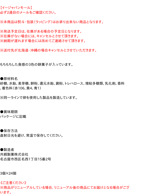 ●製造者 共親製菓株式会社 名古屋市西区名西1丁目15番2号 3個×24個【広告文責】株式会社イージャパンアンドカンパニーズ 072-875-6666《ご注意ください》 ※商品がリニューアルしている場合、リニューアル後の商品にてお届けとなる場合がございます。