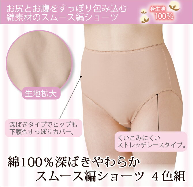ギフト対応 商品名:綿100%深ばきやわらかスムース編ショーツ 4色組 旬なキーワード:ショーツ パンツ 深ばき のびる フィット 綿100% 4枚組
