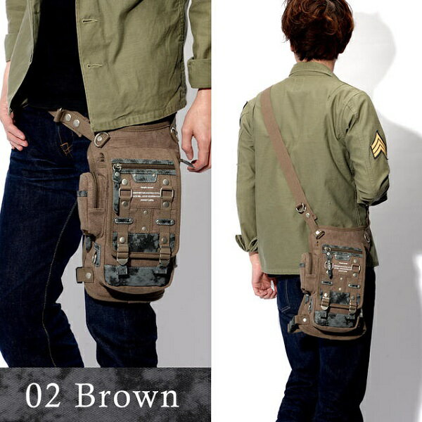 迷彩柄ではなくムラ感のある生地を使用し、更にテープ使いやポイントに入れた 白プリントで今までにない印象のミリタリーバッグとなってます! まだ珍しいレッグポーチは、本格的な軍物をベースに 現代のファッションに落とし込んだミリタリーバッグの一種で、 バイク乗りや作業系の方に人気! 普段のコーディネートに合わせる事で 簡単にワンランク上の個性派ファッションを演出! 【素材】 テトロンコットン/合皮(PU 合成皮革 フェイクレザー コットン 綿) 【サイズ・容量】 本体袋部分 : タテ 約24cm/ ヨコ 約13.5cm/ マチ 約6.5cm 本体背面部分 : タテ 約34cm/ ヨコ 約22cm 本体開口サイズ : 約13.5cm 正面フラットポケット:タテ 約20cm/ ヨコ 約13.5cm/ マチ 約0cm 正面ZIPポケット:タテ 約15.5cm/ ヨコ 約12.5cm/ マチ 約0cm サイドポケット:タテ 約11.5cm/ ヨコ 約5cm/ マチ 約3cm 本体下部細ベルトサイズ : 長さ 約24.5cm〜48cm (※接続金具の長さ含まない。