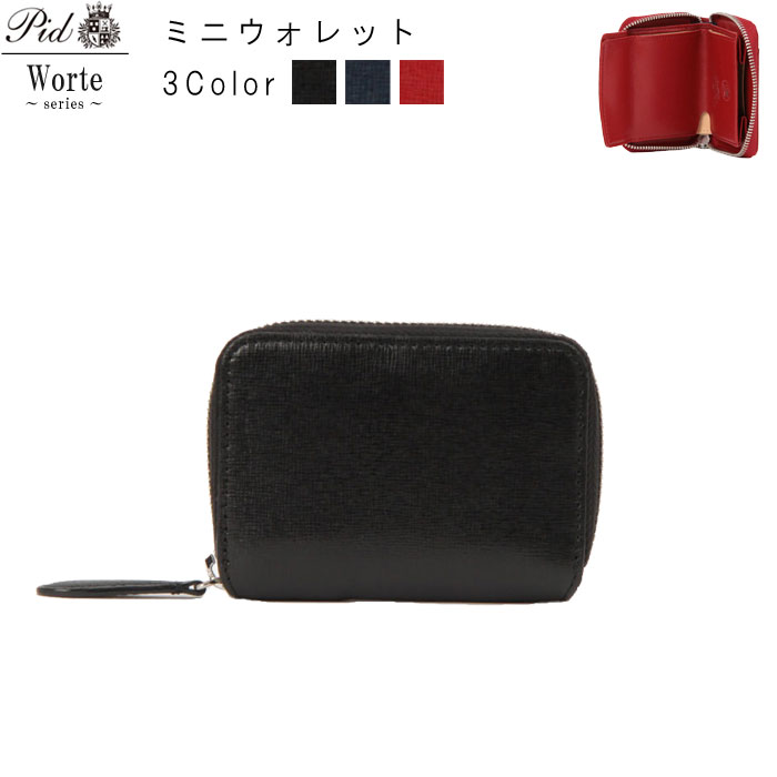 ラウンドファスナー ミニウォレット 3つ折り財布 クロ コン アカ Worte ウォルテ PID ピー・アイ・ディー 牛革 本革 革 レザー コンパクト ウォレット 財布 さいふ カード入れ 小銭入れ ユニセックス 送料無料 【QSM-100】