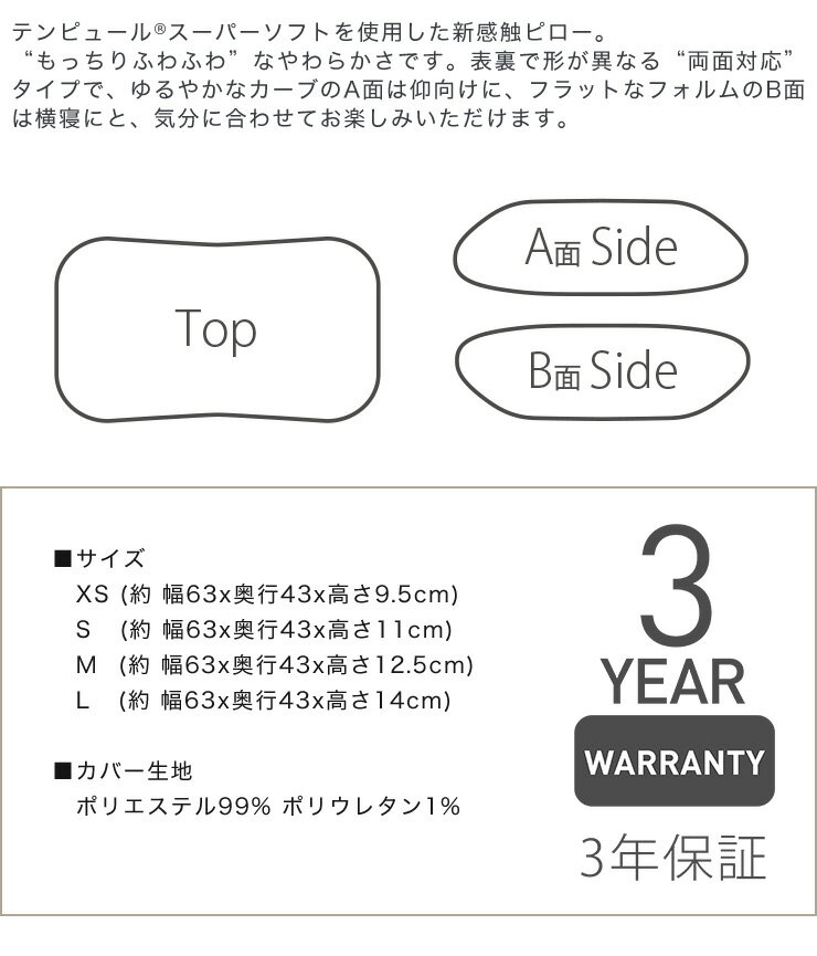 シンフォニーピローサイズ/XS (約 幅63x奥行43x高さ9.5cm)S (約 幅63x奥行43x高さ11cm)M (約 幅63x奥行43x高さ12.5cm)L (約 幅63x奥行43x高さ14cm)カバー生地/ポリエステル99% ポリウレタン1%スーパーソフトのテンピュール素材を使用し、ソフト感がアップ。