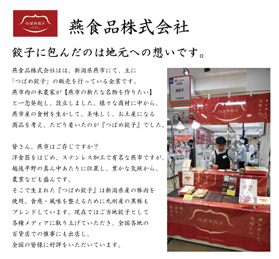 ・名称:つばめ餃子60個食べ比べセット ・内容量:20個×3(60個) ・賞味期限:製造より180日 ・保存方法:要冷凍(18℃以下) ・原材料: ◆レギュラー・ピリ辛タイプ キャベツ(国産)、豚肉、小麦粉、にら、にんにく、植物性油脂、玉葱、生姜、食塩、りん ご、醤油、味噌、香辛料、ごま油、ごま、馬 鈴薯澱粉/加工澱粉、調味料(アミノ酸等) ◆マイルド・辛味なしタイプ キャベツ(国産)、豚肉、小麦粉、にら、にんにく、植物性油脂、玉葱、生姜、食塩、りん ご、醤油、味噌、香辛料、ごま油、ごま、馬 鈴薯澱粉/加工澱粉、調味料(アミノ酸等) ◆男の燕餃子 キャベツ(国産)、豚肉、小麦粉、ニラ、神楽南蛮(かぐら南蛮(赤)漬け材料(塩))、にんにく、食塩、植物油脂、玉葱、リンゴ、味噌、香辛料、ごま/加工澱粉、調味料(アミノ酸等)※調味料の一部に大豆を含む キャベツ(国産)、豚肉、小麦粉、にら、神楽南蛮(かぐら南蛮(赤)漬け材料(塩))、にんにく、食塩、植物性油脂、玉葱、りんご、味噌、香辛料、ごま/加工澱粉、調味料(アミノ酸等) ・販売者:燕食品株式会社(新潟県燕市)